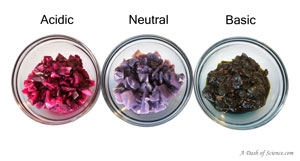 Change the actual cabbage color by boiling the cabbage in the acidic or basic solutions. Acidic solution: 100mL water and 20mL vinegar. Basic solution: 120 mL water and 1/4 tsp baking soda. There is a lot less water (only about 1/2 cup) so make sure the cabbage doesn’t scorch.